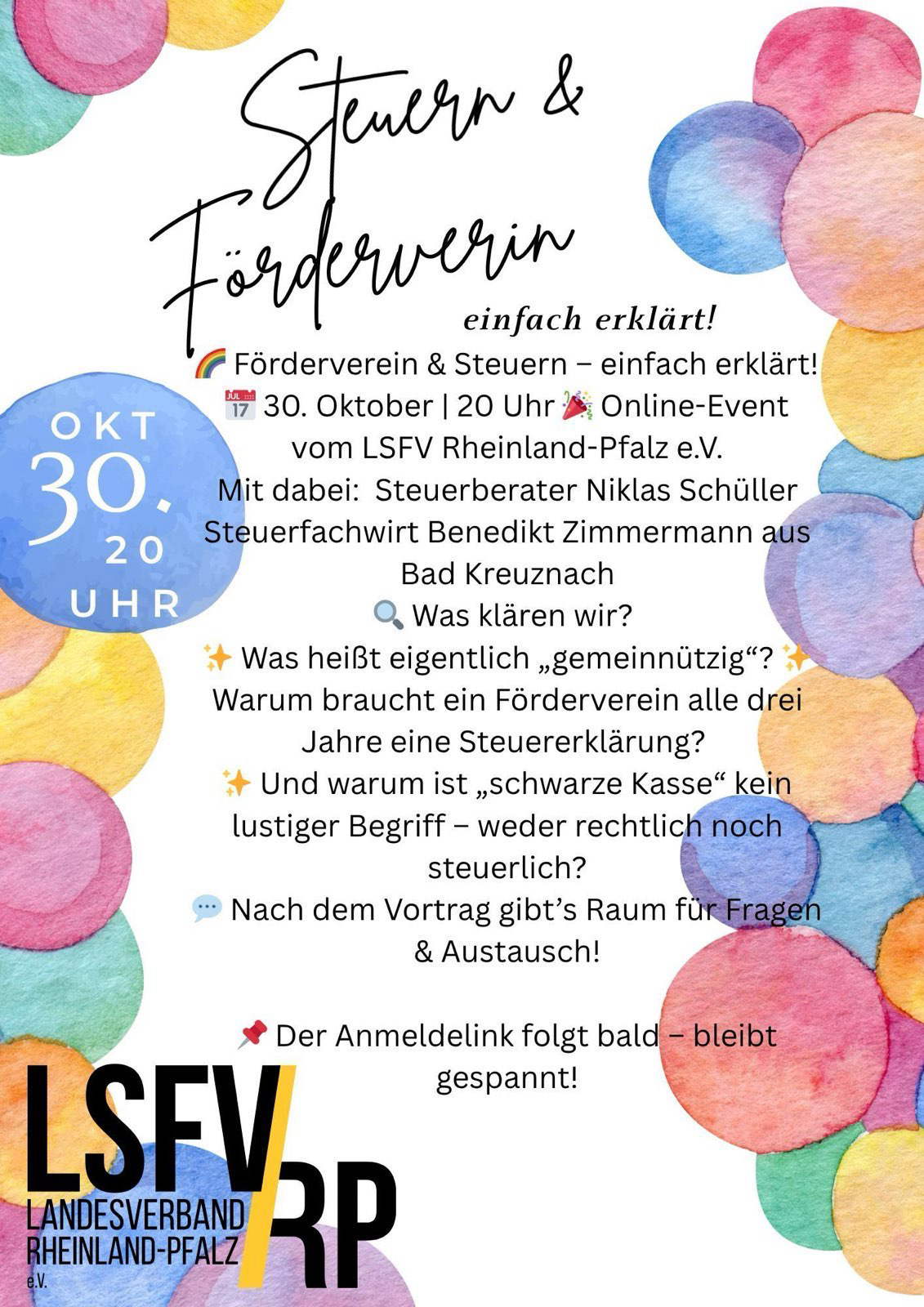 Online-Schulung des LSFV Rheinland-Pfalz am 30. Oktober 2025: Förderverein & Steuern – einfach erklärt!