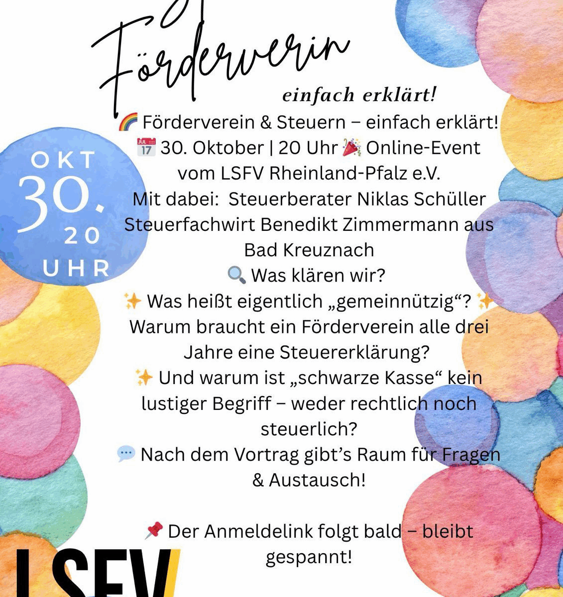 Online-Schulung des LSFV Rheinland-Pfalz am 30. Oktober 2025: Förderverein & Steuern – einfach erklärt!